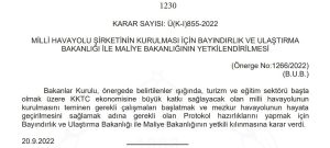 Το Υπουργείο Δημοσίων Έργων και Συγκοινωνιών και το Υπουργείο Οικονομικών εξουσιοδοτήθηκαν για την ίδρυση του εθνικού αερομεταφορέα της Τουρκικής Δημοκρατίας της Βόρειας Κύπρου.