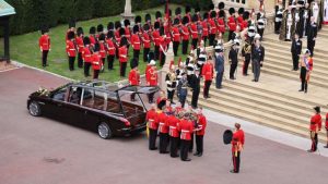 Αφού ολοκληρώθηκε το τελετουργικό της νεκρώσιμης ακολουθίας και της πομπής στο Λονδίνο, παρουσία εκατοντάδων επίσημων προσκεκλημένων, η σορός της βασίλισσας Ελισάβετ ξεκίνησε το ταξίδι προς την τελευταία κατοικία της στο Γουίντσορ.
