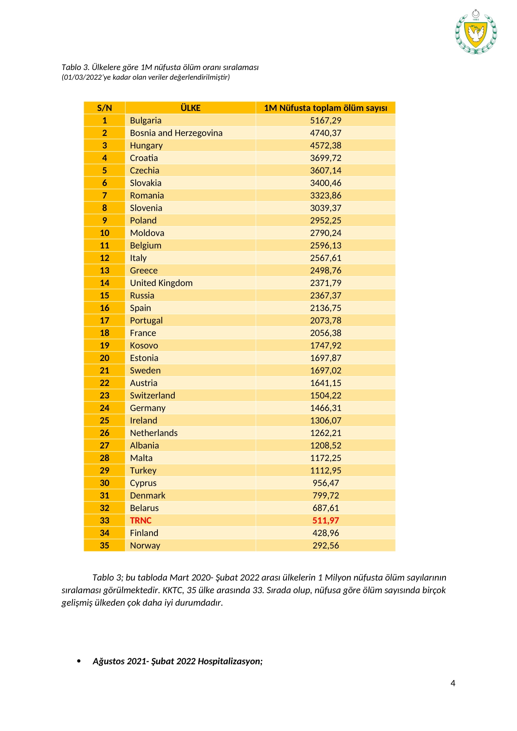 Η ΤΔΒΚ κατέλαβε την 22η θέση μεταξύ 35 χωρών και την 33η θέση στους θανάτους, σύμφωνα με την αναλογία πληθυσμού.