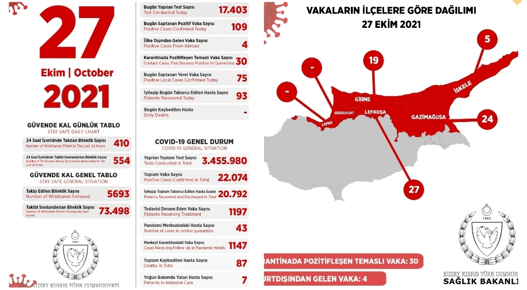 Τα τέσσερα περιστατικά αφίχθησαν στην χώρα από το εξωτερικό, ενώ τα 27 περιστατικά εντοπίστηκαν στην επαρχία Λεφκόσια, τα 19 στην Γκίρνε, τα 24 στην Γκαζίμαγουσα και τα 5 στην Ισκέλε.
