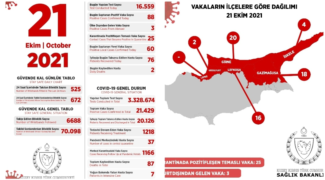 Τα τρία περιστατικά αφίχθησαν στην χώρα από το εξωτερικό, ενώ τα 16 περιστατικά εντοπίστηκαν στην επαρχία Λεφκόσια, τα 20 στην Γκίρνε, τα 18 στην Γκαζίμαγουσα, τα 4 στην Ισκέλε και τα δύο στην Γκιουζέλγιουρτ.