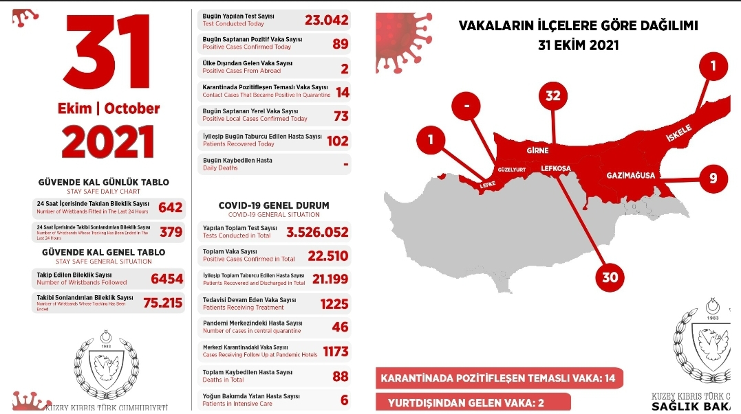 Τα δύο περιστατικά αφίχθησαν στην χώρα από το εξωτερικό, ενώ τα 30 περιστατικά εντοπίστηκαν στην επαρχία Λεφκόσια, τα 32 στην Γκίρνε, τα 9 στην Γκαζίμαγουσα, το ένα στην Ισκέλε και το ένα στην Λέφκε.