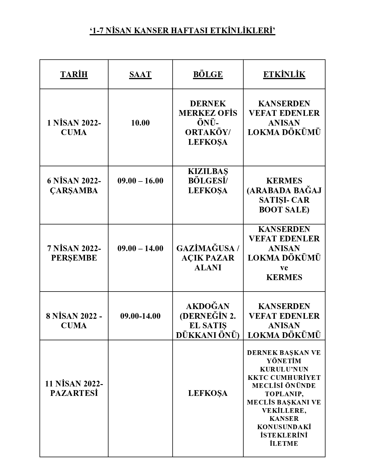 1-7 NİSAN KANSER HAFTASI ETKİNLİKLERİ: