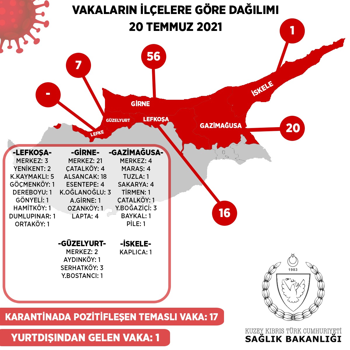 16 kişi Lefkoşa, 56 kişi Girne, 20 kişi Gazimağusa, 7 kişi Güzelyurt, 1 kişi İskele Bölgesi’ndendir.