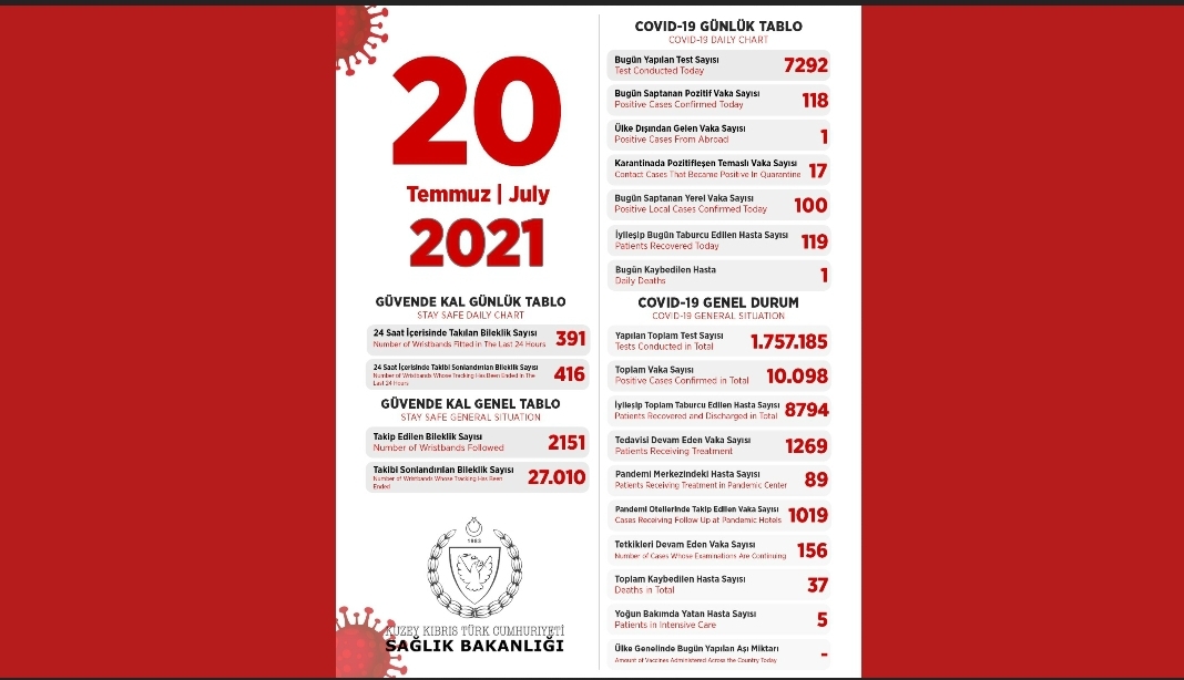 Son 24 saatte yapılan test sayısı 7292 olup, 100’ü yerel 118 pozitif vakaya rastlanmış, 1 kişi hayatını kaybetmiş, 119 kişi taburcu edilmiştir.