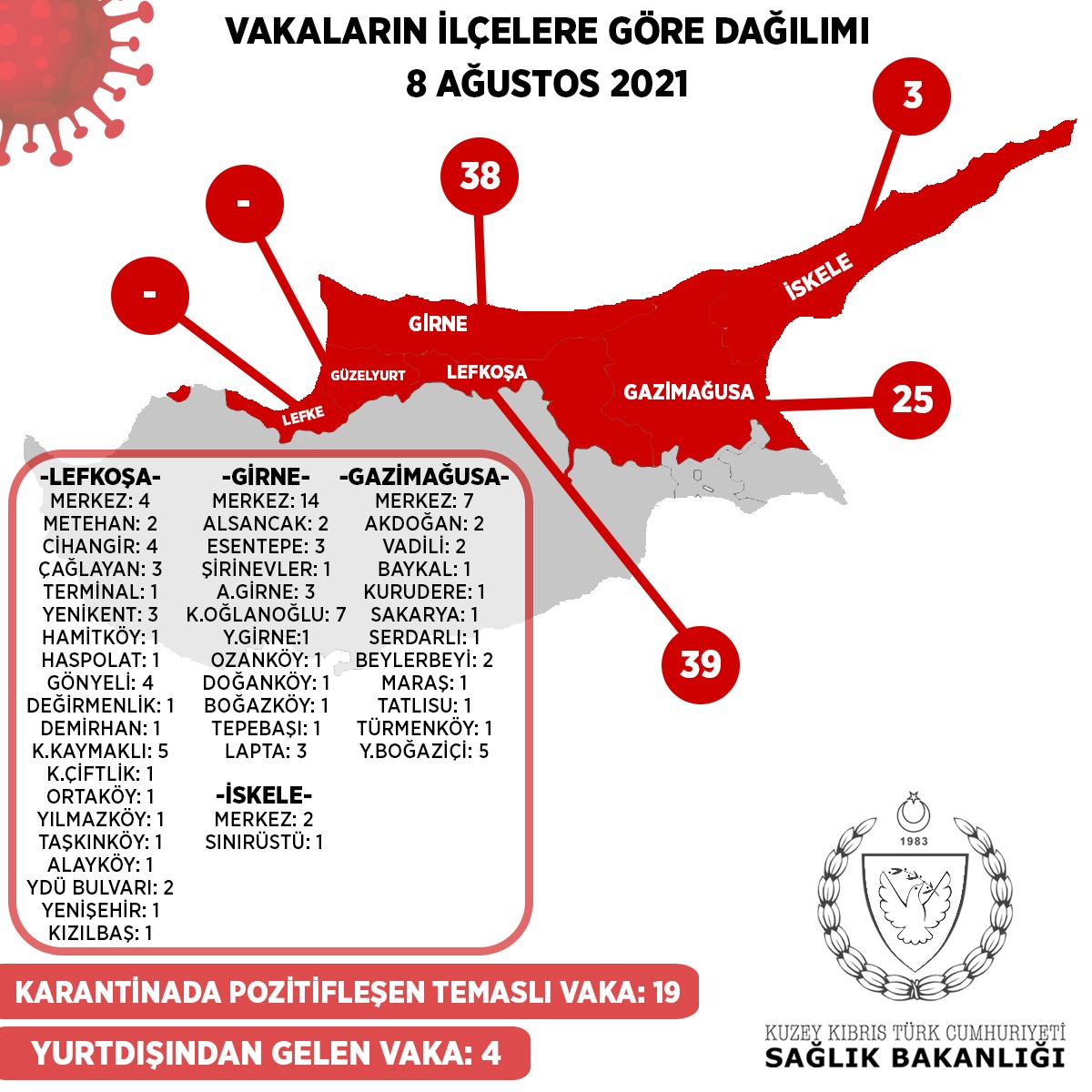 3 kişi yurt dışından hava yolu, 1 kişi deniz yolu ile ülkemize gelmiştir. 19 kişi daha önce tespit edilen vakaların temaslılarıdır ve bu süre içinde gözetim altında bulunmaktadırlar. 105 kişi ise yerel vakadır.