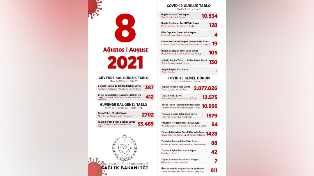 Son 24 saatte yapılan test sayısı 10.534 olup, 105’i yerel 128 pozitif vakaya rastlanmış, 130 kişi taburcu edilmiştir.