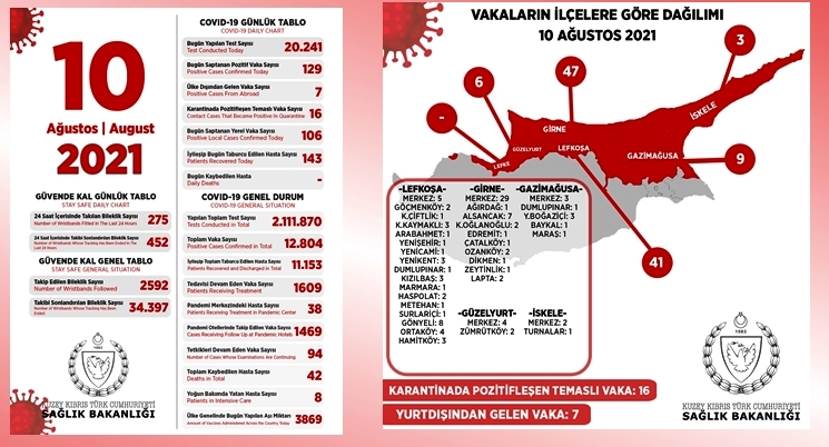 Son 24 saatte yapılan test sayısı 20.241 olup, 106’sı yerel 129 pozitif vakaya rastlanmış, 143 kişi taburcu edilmiştir.