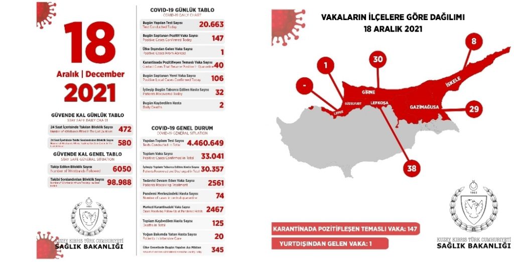 Son 24 saatte yapılan test sayısı 20.663 olup, 106’sı yerel 147 pozitif vakaya rastlanmış, 2 kişi hayatını kaybetmiş, 32 kişi taburcu edilmiştir.