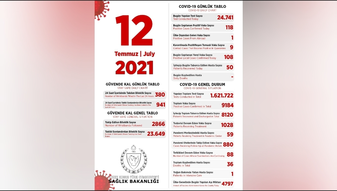 Son 24 saatte yapılan test sayısı 24.741 olup, 108’i yerel 118 pozitif vakaya rastlanmış,50 kişi taburcu edilmiştir.