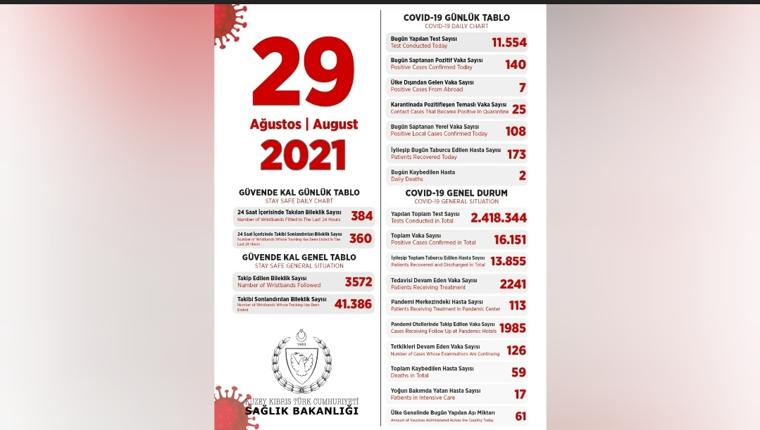 Son 24 saatte yapılan test sayısı 11.554 olup, 108’i yerel 140 pozitif vakaya rastlanmış, 2 kişi hayatını kaybetmiş, 173 kişi taburcu edilmiştir.