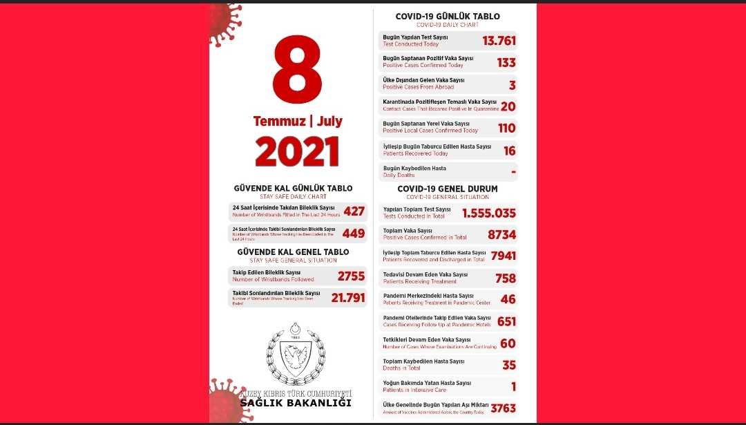 Son 24 saatte yapılan test sayısı 13.761olup, 110’u yerel 133 pozitif vakaya rastlanmış, 16 kişi taburcu edilmiştir.