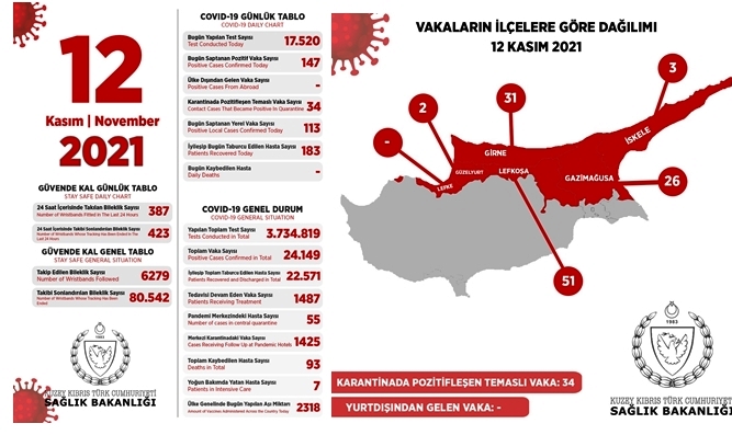 Son 24 saatte yapılan test sayısı 17.520 olup, 113’ü yerel 147 pozitif vakaya rastlanmış, 183 kişi taburcu edilmiştir.