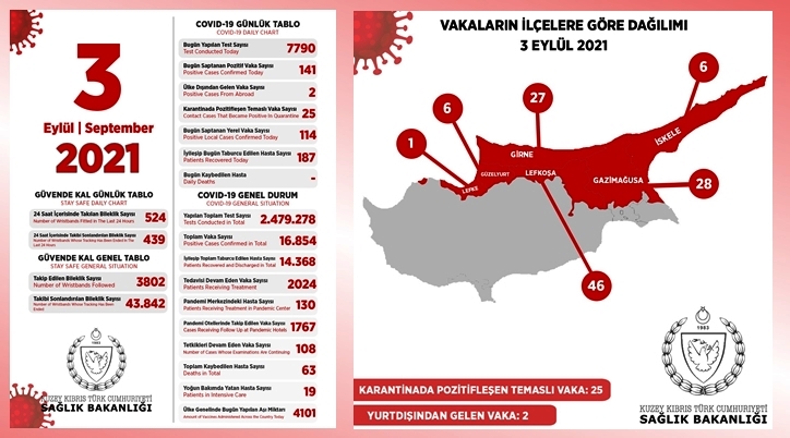 Son 24 saatte yapılan test sayısı 7790 olup, 114’ü yerel 141 pozitif vakaya rastlanmış, 187  kişi taburcu edilmiştir.