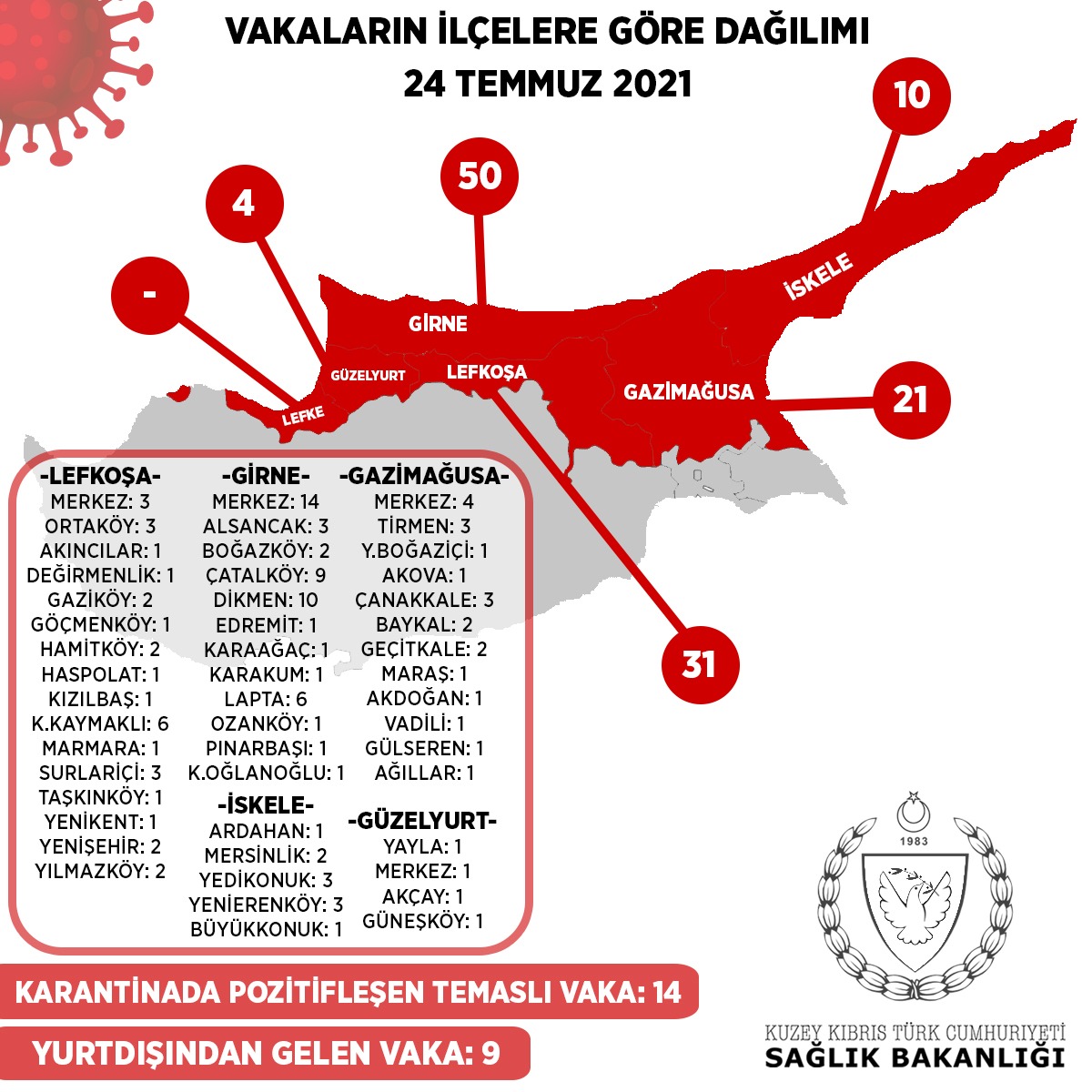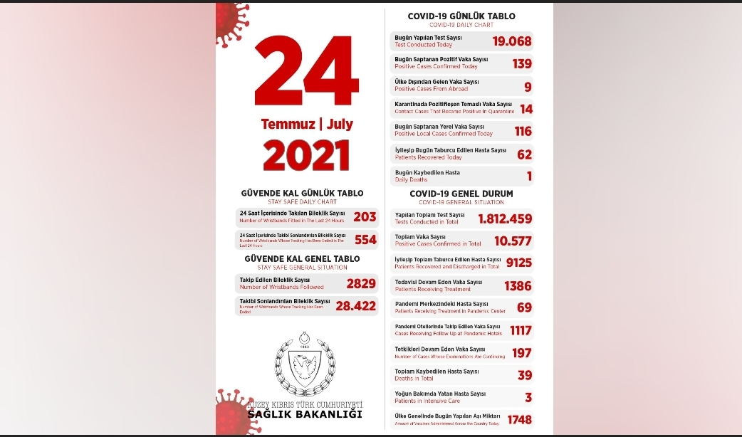 Son 24 saatte yapılan test sayısı 19.068 olup, 116’sı yerel 139 pozitif vakaya rastlanmış,1 kişi hayatını kaybetmiş, 62 kişi taburcu edilmiştir.