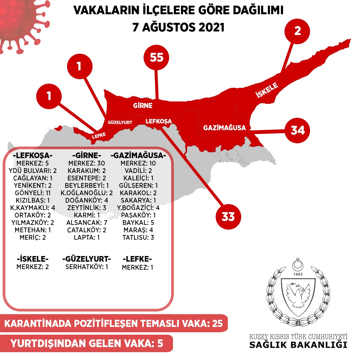33 kişi Lefkoşa, 55 kişi Girne, 34 kişi Gazimağusa, 2 kişi İskele, 1 kişi Güzelyurt, 1 kişi Lefke Bölgesi’ndendir.