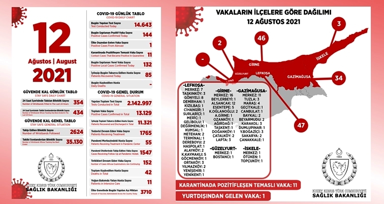 Son 24 saatte yapılan test sayısı 14.643 olup, 132’si yerel 144 pozitif vakaya rastlanmış, 85 kişi taburcu edilmiştir.