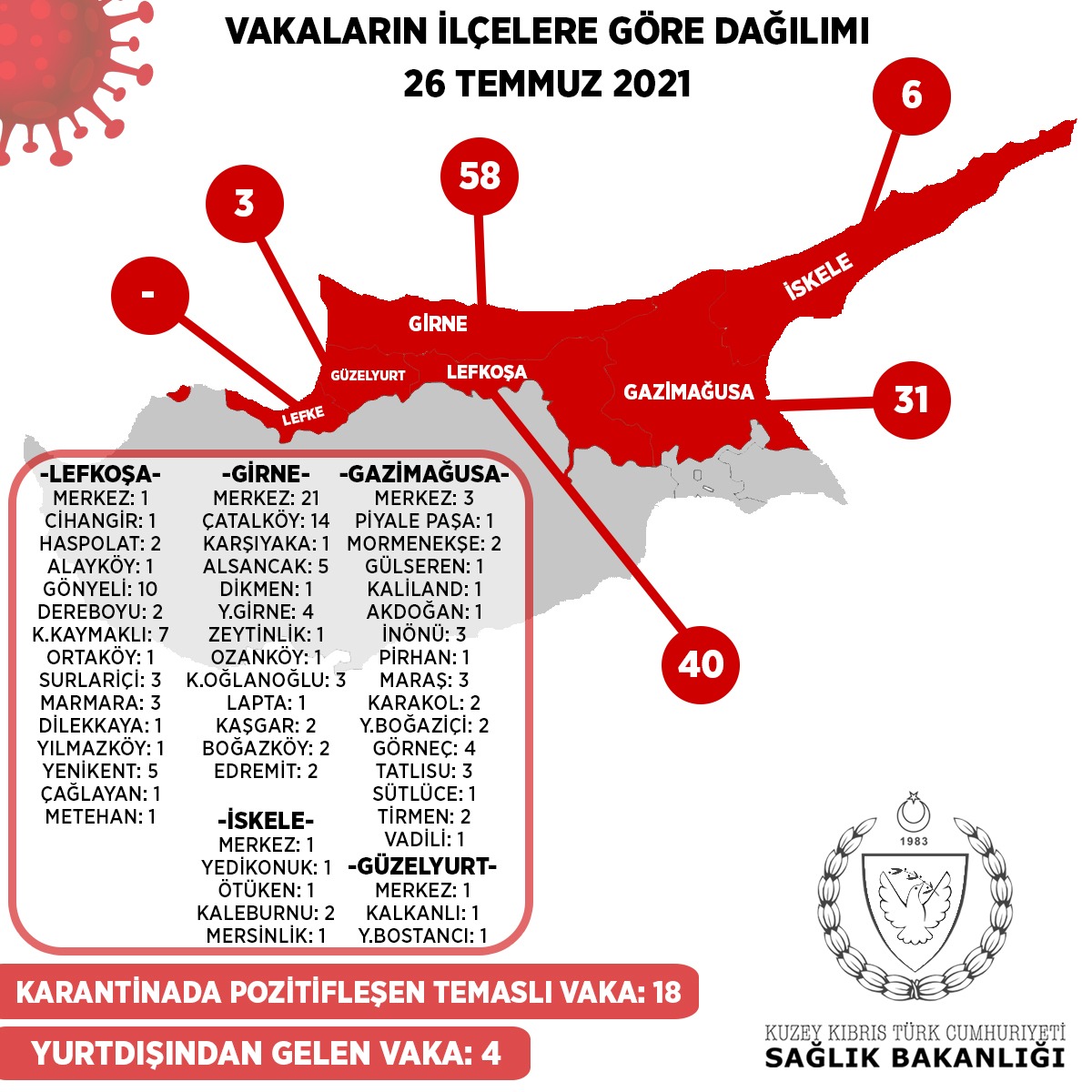 4 kişi yurt dışından hava yolu ile gelmiştir. 18 kişi daha önce tespit edilen vakaların temaslılarıdır ve bu süre içinde gözetim altında bulunmaktadırlar. 138 kişi ise yerel vakadır.