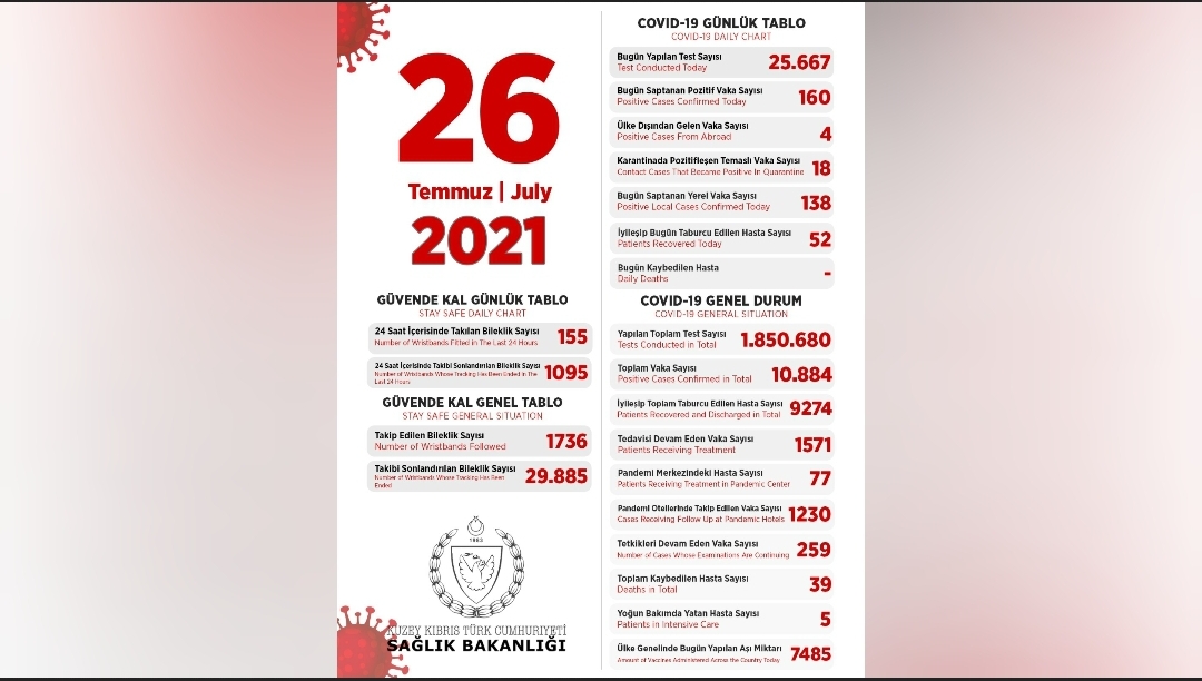 Son 24 saatte yapılan test sayısı 25.667 olup, 138’i yerel 160 pozitif vakaya rastlanmış, 52 kişi taburcu edilmiştir.