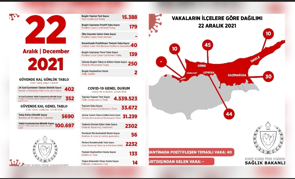 Son 24 saatte yapılan test sayısı 15.388 olup, 139’u yerel 179 pozitif vakaya rastlanmış, 2 kişi hayatını kaybetmiş, 250 kişi taburcu edilmiştir.