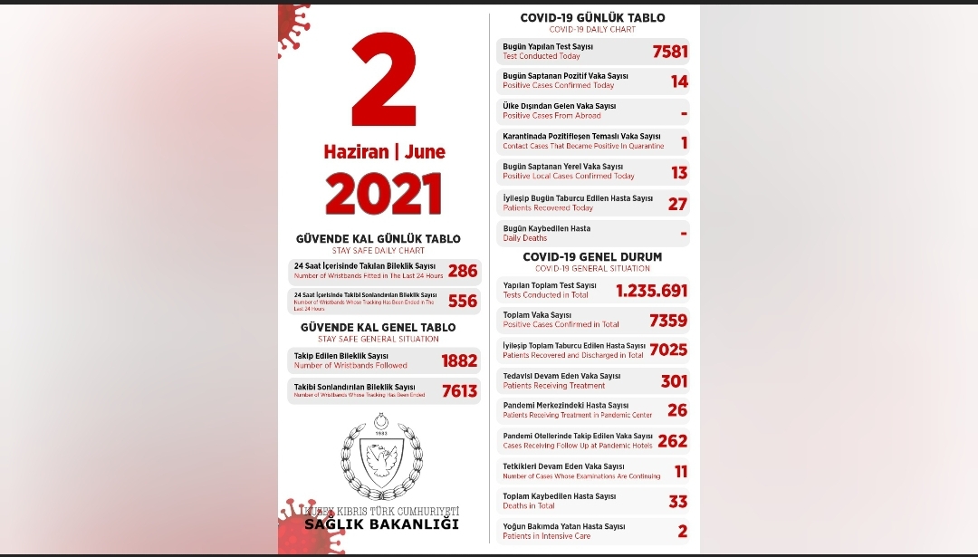 Son 24 saatte yapılan test sayısı 7581 olup, 13’ü yerel 14 pozitif vakaya rastlanmış 27 kişi taburcu edilmiştir.