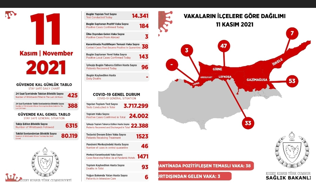 Son 24 saatte yapılan test sayısı 14.341 olup, 143’ü yerel 184 pozitif vakaya rastlanmış, 96 kişi taburcu edilmiştir.