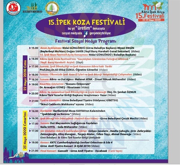 Cumartesi, saat 16.00’dan itibaren, Karikatürist Musa Kayra’nın “ipekböceği ve corona” başlıklı video sunumu, Girne belediyesi Çocuk Meclisinin “İpekböceği’nin dönüşümü” konulu kısa video sunumları yapılacak. Aynı gün 17.00’de Gıda Mühendisi Naile Soyel’in “dut meyvesinin sağlığımıza faydaları” başlıklı videosu gösterilecek. 17.30’da ise Girne Belediyesi ve Kıbrıs Türk Yazarlar Birliği işbirliğinde, Gülşen Şenderin , Hasibe Şahoğlu, Yıltan Taşçı, Şirin Zaferyıldızı Zaimağaoğlu, Altay Akalın, Turgay Akalın, Ahmet Ömerağa şiir dinletisi sunacak. Festival, saat 19.00’da Cumhurbaşkanlığı Senfoni Orkestrası ve Sıla 4’ün 6 Eylül 2019 Girne Amfitiyatro gerçekleştirdiği konserin tekrarı ve 21.00’de Gancelli Grubunun Girne Amfitiyatroda seyircisiz olarak gerçekleştireceği ve canlı yayınlanacak konserle sona erecek.