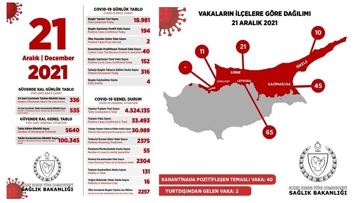 Son 24 saatte yapılan test sayısı 18.981 olup, 152’si yerel 194 pozitif vakaya rastlanmış, 4 kişi hayatını kaybetmiş, 316 kişi taburcu edilmiştir.