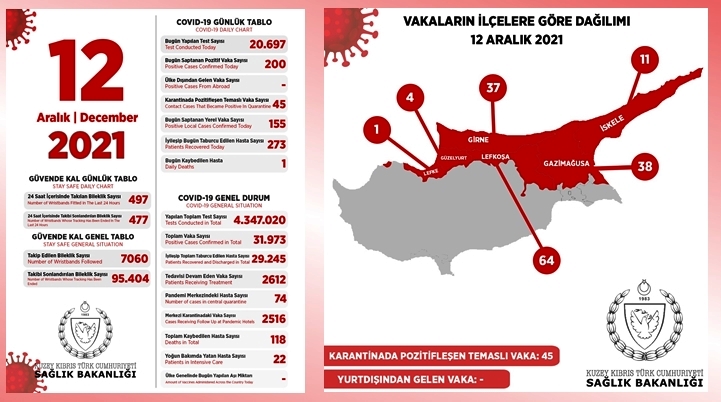 Son 24 saatte yapılan test sayısı 20.697 olup, 155’i yerel 200 pozitif vakaya rastlanmış, 1 kişi hayatını kaybetmiş, 273 kişi taburcu edilmiştir.