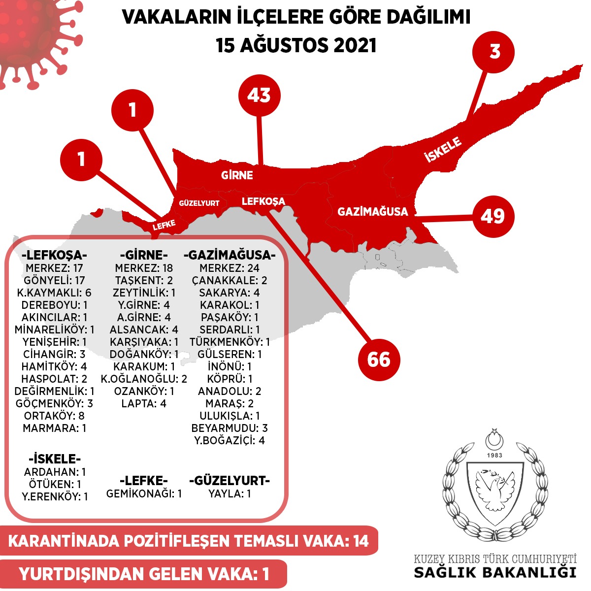1 kişi yurt dışından hava yolu ile ülkemize gelmiştir. 14 kişi daha önce tespit edilen vakaların temaslılarıdır ve bu süre içinde gözetim altında bulunmaktadırlar. 163 kişi ise yerel vakadır.