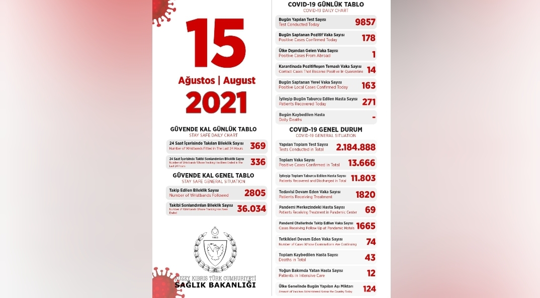 Son 24 saatte yapılan test sayısı 9857 olup, 163’ü yerel 178 pozitif vakaya rastlanmış, 271 kişi taburcu edilmiştir.