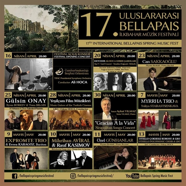Kuzey Kıbrıs Müzik Derneği’nin düzenlediği 17. Uluslararası Bellapais İlkbahar Müzik Festivali, 16 Nisan-13 Mayıs tarihleri arasında KKTC Başbakan Yardımcılığı, Turizm, Kültür, Gençlik ve Çevre Bakanlığı iş birliğinde, Telsim ana sponsorluğunda, Rocks Hotel, Deniz Plaza, Bellapais Gardens, Kybele, Huzur Ağaç, Bell Tower ve Kösezade Turizm’ in katkılarıyla gerçekleştiriliyor.