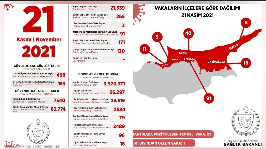 Son 24 saatte yapılan test sayısı 21.539 olup, 171’i yerel 265 pozitif vakaya rastlanmış, 130 kişi taburcu edilmiştir.