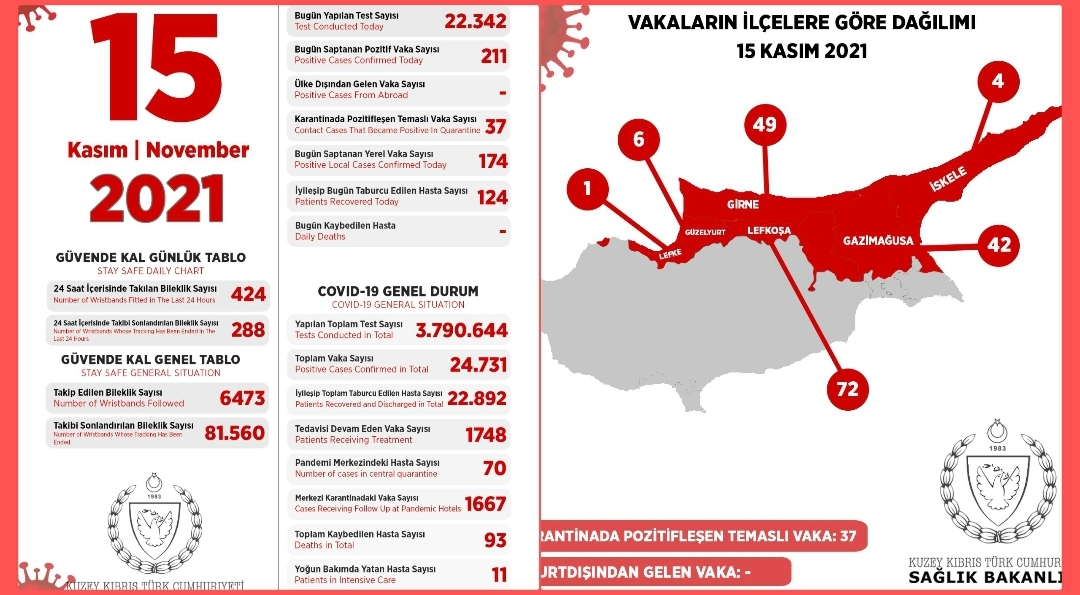 Son 24 saatte yapılan test sayısı 22.342 olup, 174’ü yerel 211 pozitif vakaya rastlanmış, 124 kişi taburcu edilmiştir.