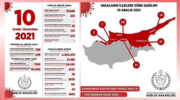 Son 24 saatte yapılan test sayısı 18.846 olup, 175’i yerel 210 pozitif vakaya rastlanmış, 272 kişi taburcu edilmiştir.