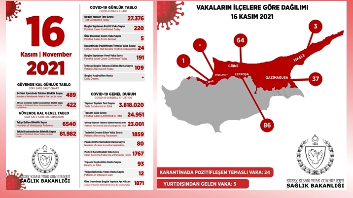 Son 24 saatte yapılan test sayısı 27.376 olup, 191’i yerel 220 pozitif vakaya rastlanmış, 109 kişi taburcu edilmiştir.