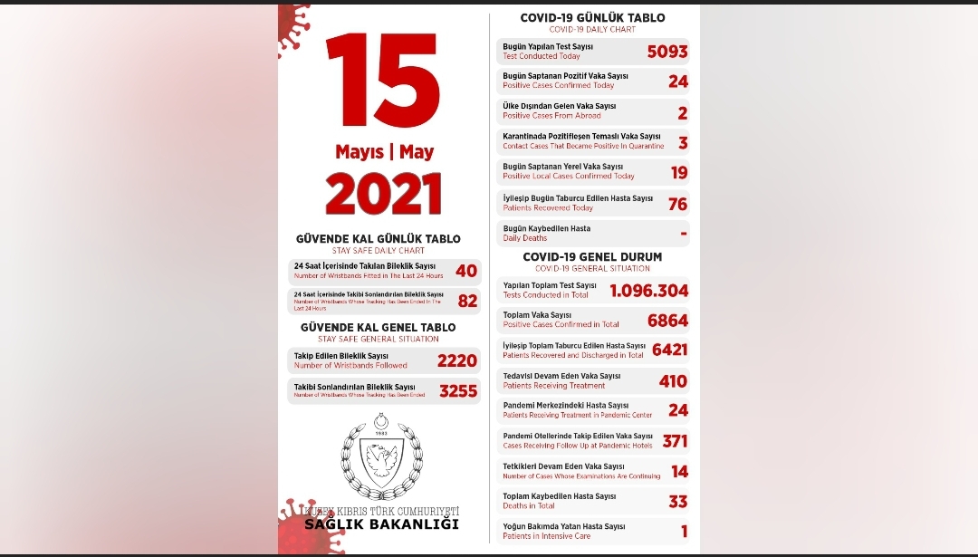 Son 24 saatte yapılan test sayısı 5093 olup, 19’u yerel 24 pozitif vakaya rastlanmış 76 kişi taburcu edilmiştir.