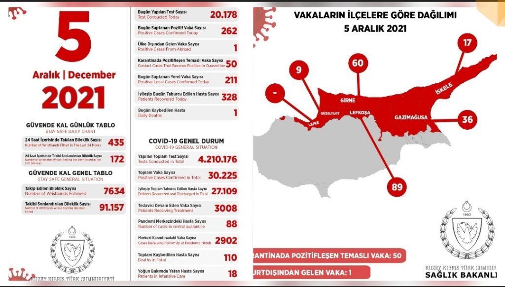 Son 24 saatte yapılan test sayısı 20.178 olup, 211’i yerel 262 pozitif vakaya rastlanmış, 1 kişi hayatını kaybetmiş, 328 kişi taburcu edilmiştir.
