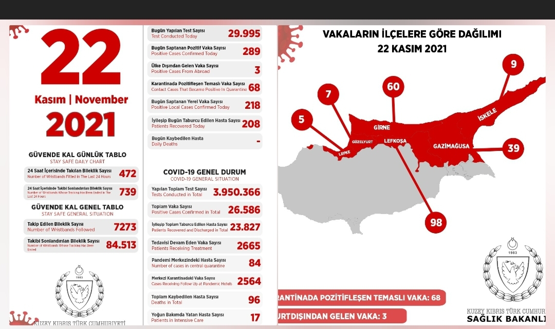 Son 24 saatte yapılan test sayısı 29.995 olup, 218’i yerel 289 pozitif vakaya rastlanmış, 208 kişi taburcu edilmiştir.