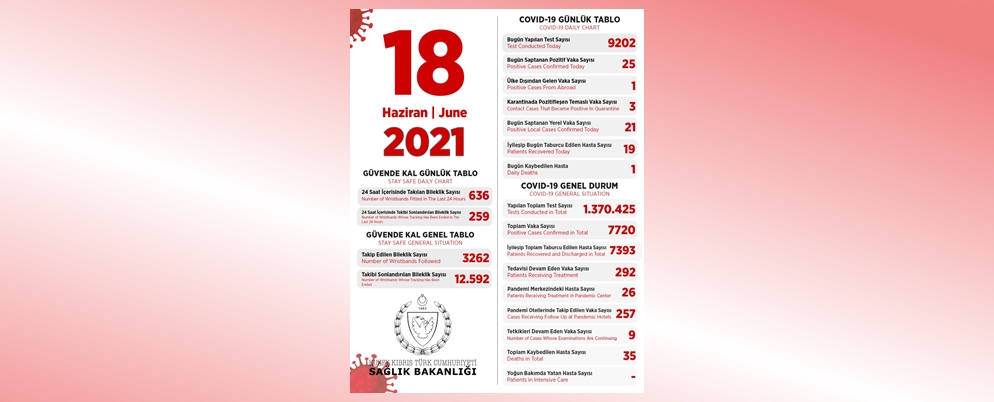 Son 24 saatte yapılan test sayısı 9202 olup, 21’i yerel 25 pozitif vakaya rastlanmış,1 kişi hayatını kaybetmiş, 19 kişi taburcu edilmiştir.