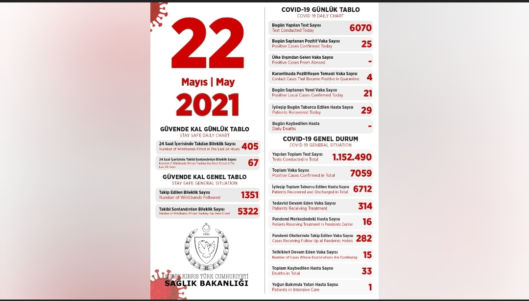 Son 24 saatte yapılan test sayısı 6070 olup, 21’i yerel 25 pozitif vakaya rastlanmış 29 kişi taburcu edilmiştir.