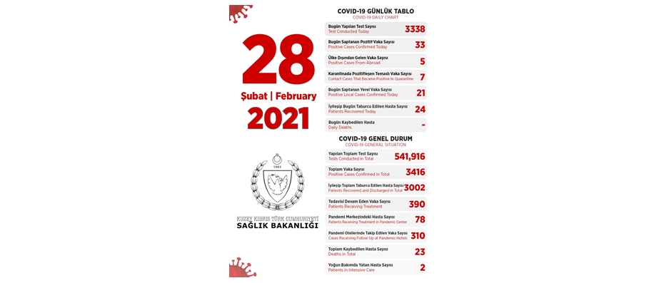 Son 24 saatte yapılan test sayısı 3338 olup, 21’i yerel 33 pozitif vakaya rastlanmış, 24 kişi taburcu edilmiştir.