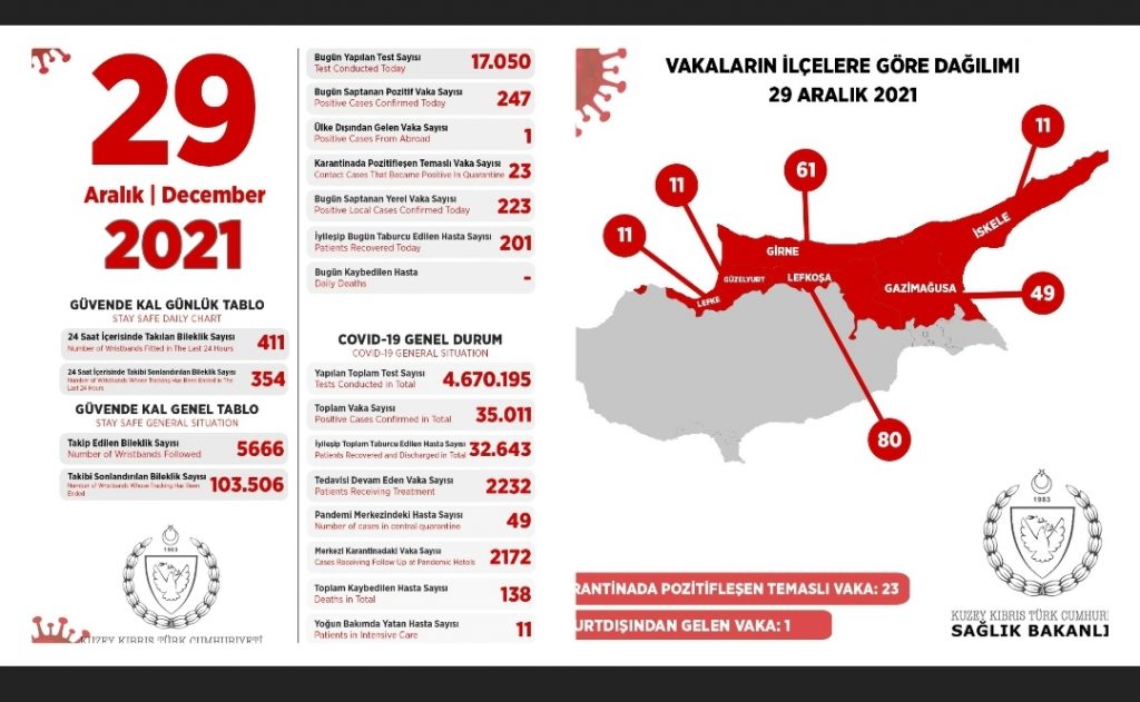 Son 24 saatte yapılan test sayısı 17.050 olup, 223’ü yerel 247 pozitif vakaya rastlanmış, 201 kişi taburcu edilmiştir.