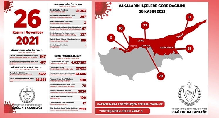 Son 24 saatte yapılan test sayısı 21.363 olup, 227’si yerel 297 pozitif vakaya rastlanmış, 159 kişi taburcu edilmiştir.