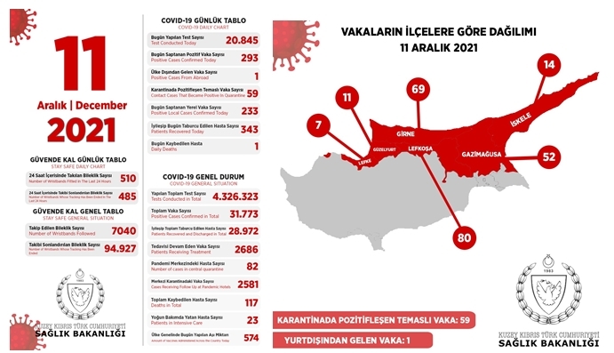 Son 24 saatte yapılan test sayısı 20.845 olup, 233’ü yerel 293 pozitif vakaya rastlanmış, 1 kişi hayatını kaybetmiş, 343 kişi taburcu edilmiştir.