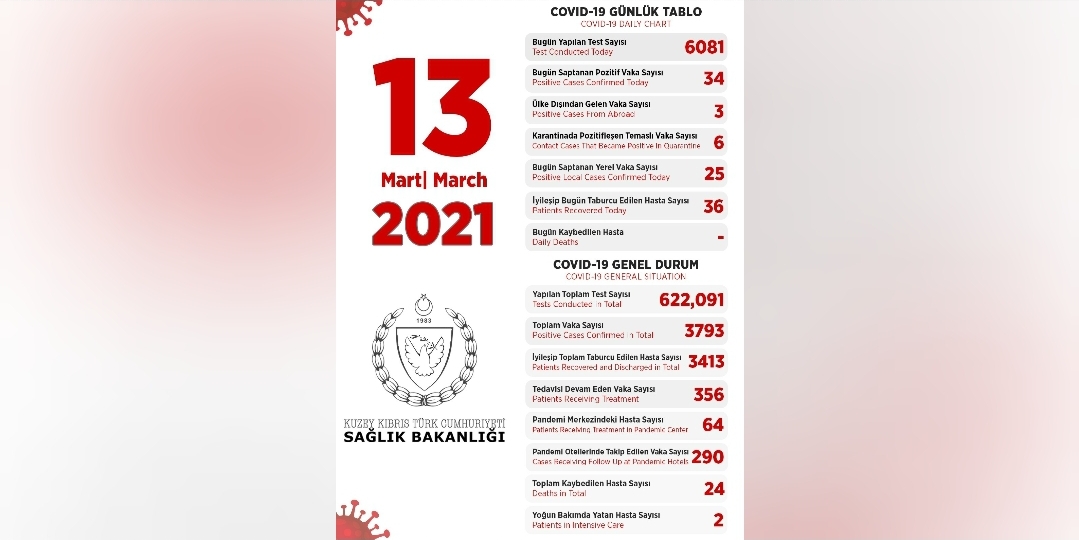 Son 24 saatte yapılan test sayısı 6081 olup, 25’i yerel 34 pozitif vakaya rastlanmış, 36 kişi taburcu edilmiştir.