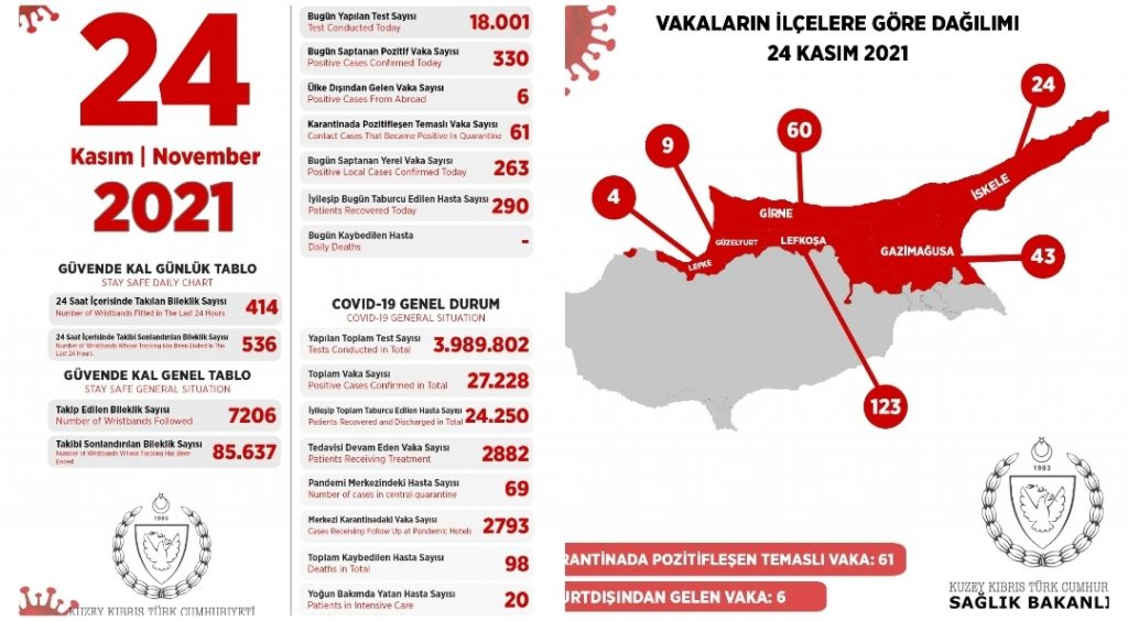 Son 24 saatte yapılan test sayısı 18.001 olup, 263’ü yerel 330 pozitif vakaya rastlanmış, 290 kişi taburcu edilmiştir.