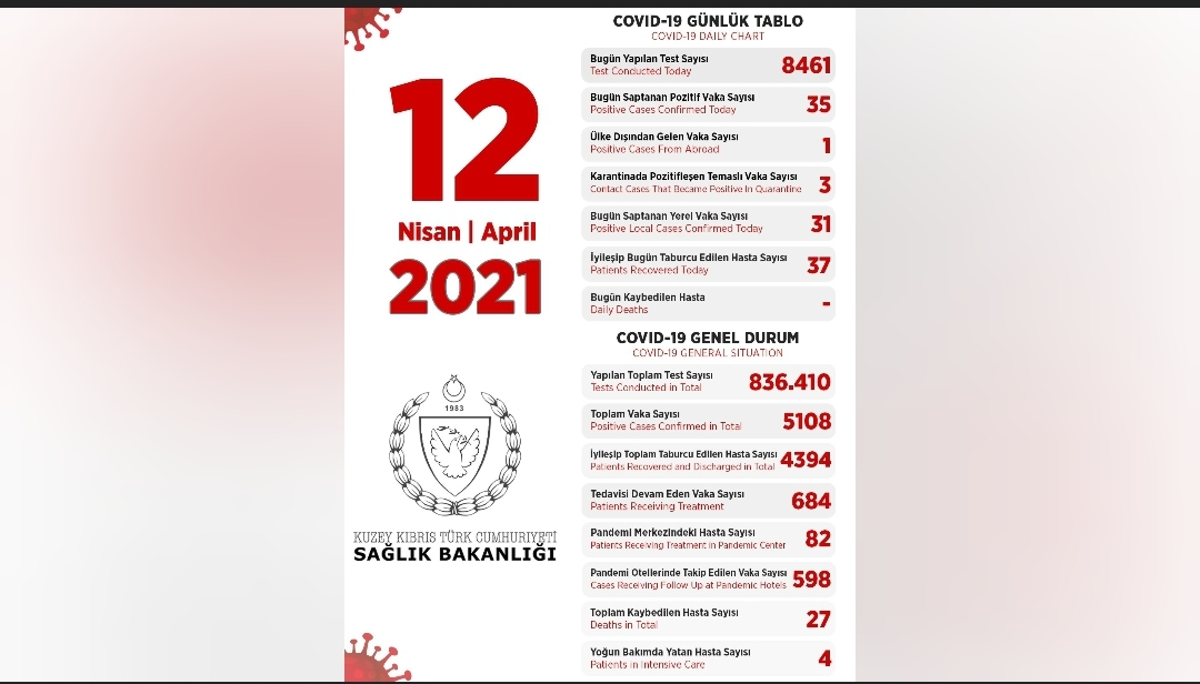Son 24 saatte yapılan test sayısı 8461 olup, 31’i yerel 35 pozitif vakaya 37 kişi taburcu edilmiştir.