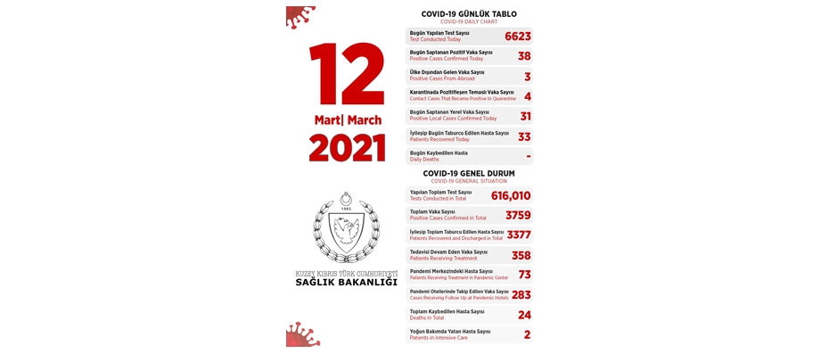 Son 24 saatte yapılan test sayısı 6623 olup, 31’i yerel 38 pozitif vakaya rastlanmış, 33  kişi taburcu edilmiştir.