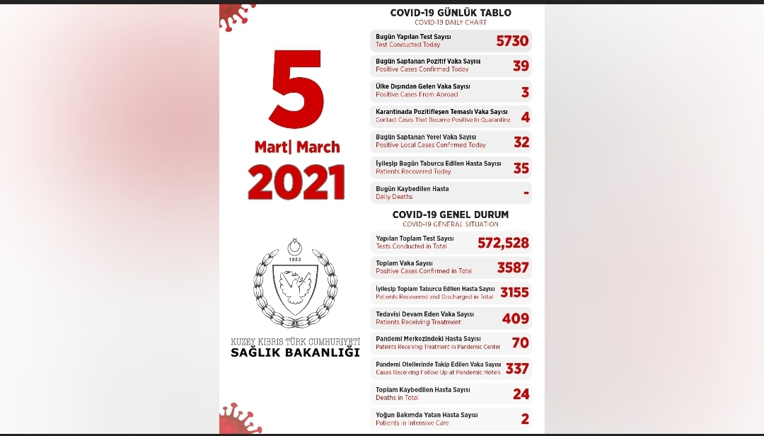 Sağlık Bakanlığı yaptığı açıklamada son 24 saatte yapılan test sayısı 5730 olup, 32’si yerel 39 pozitif vakaya rastlanmış, 35 kişi taburcu edildiğini açıkladı.